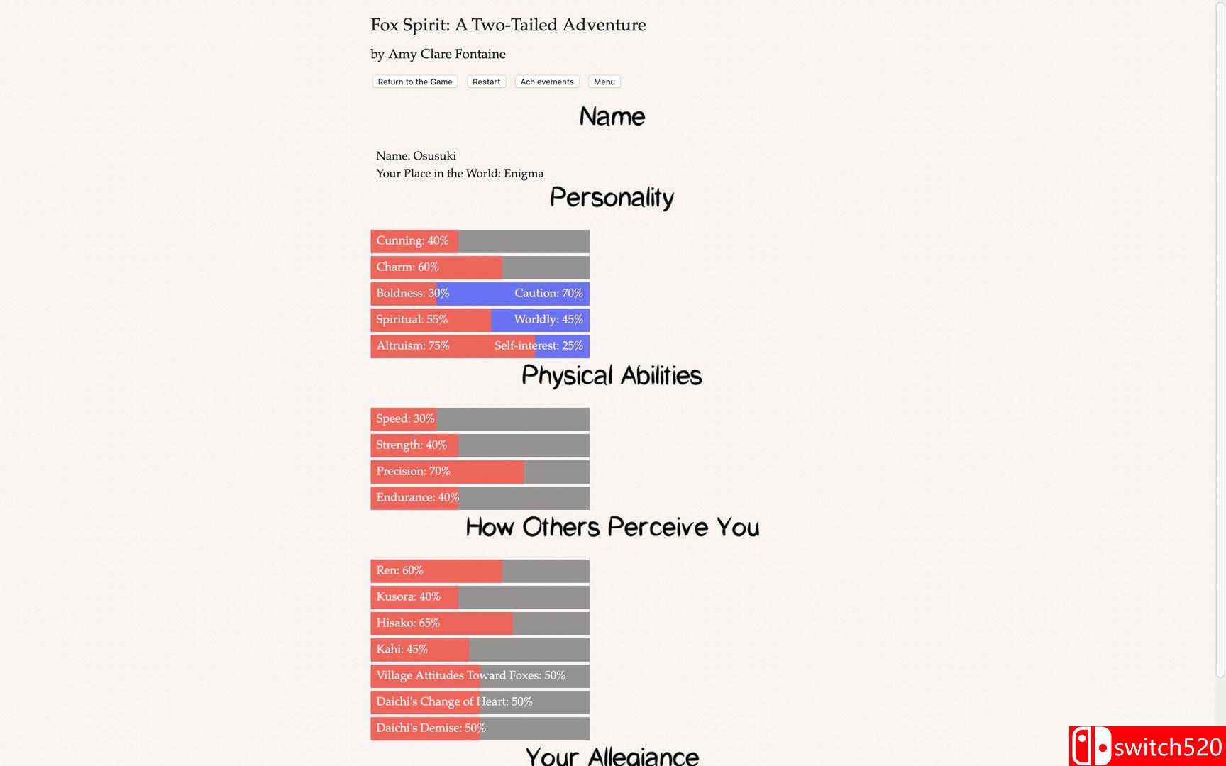 《狐灵:双尾历险记》是一款冒险解密类(AVG)游戏,《狐灵:双尾历险记》是一部由 Amy Clare Fontaine 创作、字数达 25 万字的交互式奇幻小说。游戏采用纯文本形式,完全依靠玩家的想象力驱动。你将化身为一只拥有魔力的双尾狐狸,潜入杀害你家人的仇人所在的村庄——星守村(Hoshimori),寻找传说中能赋予永生的“星珠”。在这个过程中,你可以编织幻象、变换形态,甚至操控人心。是成为仁慈的守护者、爱恶作剧的捣蛋鬼,还是凶猛残暴的恶魔?你的每一个选择都将决定你在这个世界留下的足迹。switch520